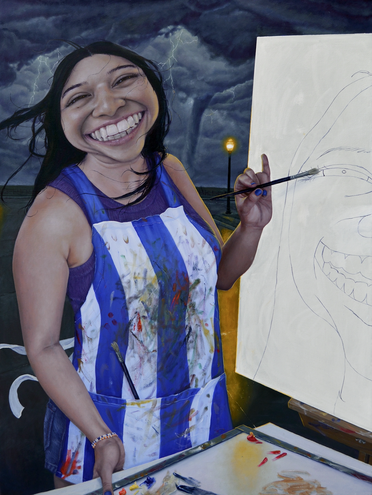 CS: I've been working on figuring that out for the past year because these exaggerated smiles started popping up in my sketchbook. They very much started as a representation of myself, what I think I look like. For the past three years or however long I've been just painting myself very, very realistically, it never felt super like me, in a way. At one point, it was like painting a random person. Like, [laughs] I was just painting a nose. It wasn't necessarily my nose or anything like that! Being at RISD, they've been pushing me to experiment a little bit more. I was like, “I'm just going to give it a shot”, you know, “paint this and see kind of where it takes me”. Now it has turned into this manifestation of myself and my biggest insecurities. I've been using this more caricature-style “me” as a character in these worlds that I'm building, and having this character interact with different objects and the more proportional “me”. And so I think that's the direction that I'm leading myself into, but it's all very much been intuition and trying to figure out what this means for me. I knew that it was something that I wanted to pursue and explore a little bit more.