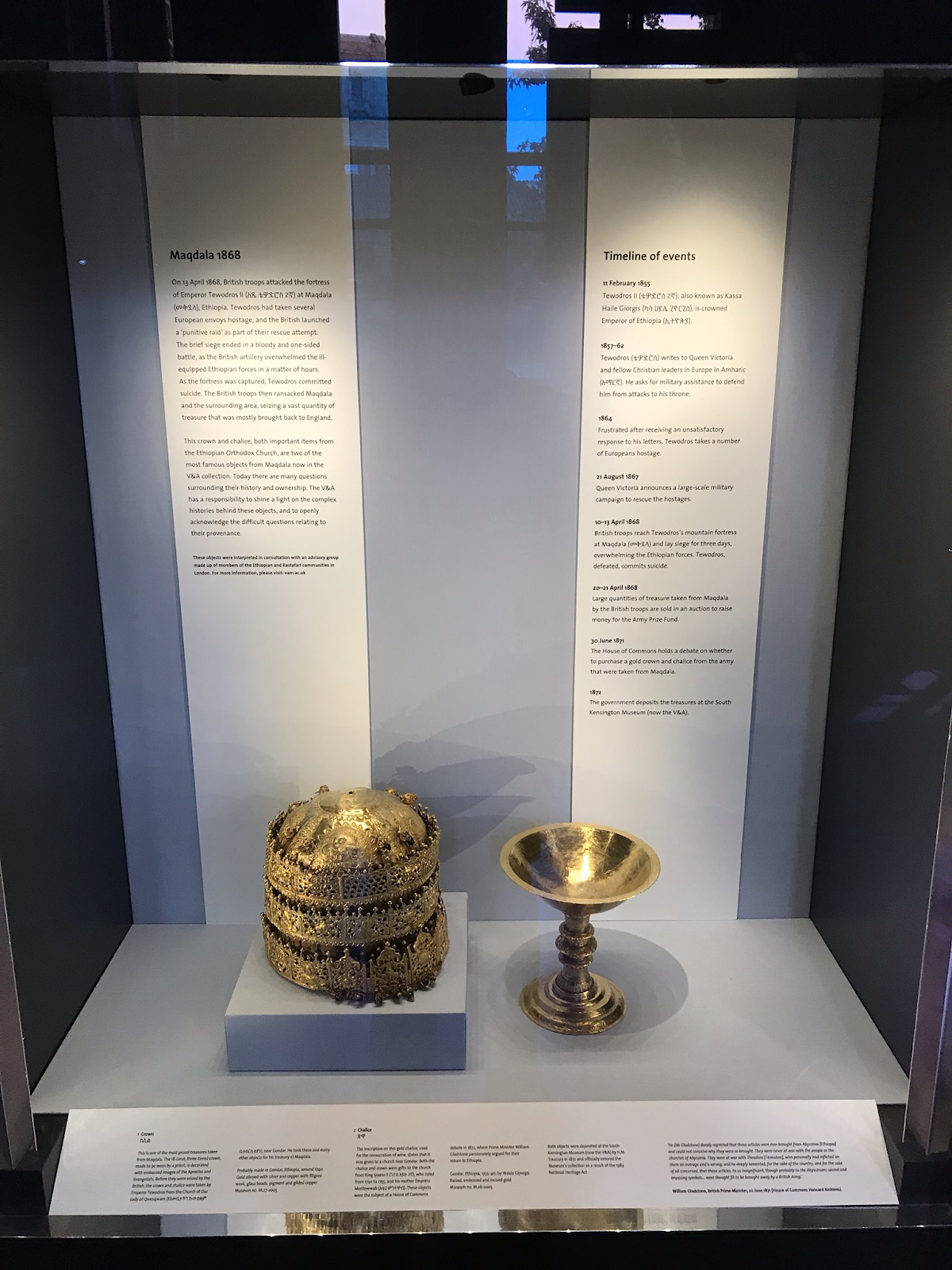 In the V&A’s more recent attempts to “confront and interrogate the colonial histories of their collections,” the most notable example is their Maqdala 1868 exhibition. In this fourteen month exhibition, which ran from 5 April 2018 to 30 June 2019, the museum told the story of Lord Napier’s Abyssinian Expedition by displaying the Crown, among other pillaged Ethiopian artifacts (Jones, “Maqdala and the South Kensington Museum,” 71). Since the museum did not previously acknowledge the objects’ controversial history, it was up to curators to “reflect on [the object’s] living meaning” without separating them from their “violent provenance” and recognizing that they were initially the “spectacle of the remains of a defeated enemy” (Jones, “Maqdala and the South Kensington Museum,” 74). In the process of curating the display, which marked the 150th anniversary of the Mäqdäla siege, Jones relied on a “focus group” of Ethiopian and Rastafarian community leaders, historians and activists along with input from the Ethiopian embassy in London to guide the purpose and essence of the exhibition (Jones, “Maqdala and the South Kensington Museum,” 75-76). The main takeaways from the meetings were that (1) the museum not “‘shy away’ from controversy,” (2) the objects’ provenance was “presented openly and honestly,” and (3) the exhibition must “stand out” (Jones, “Maqdala and the South Kensington Museum,” 76).