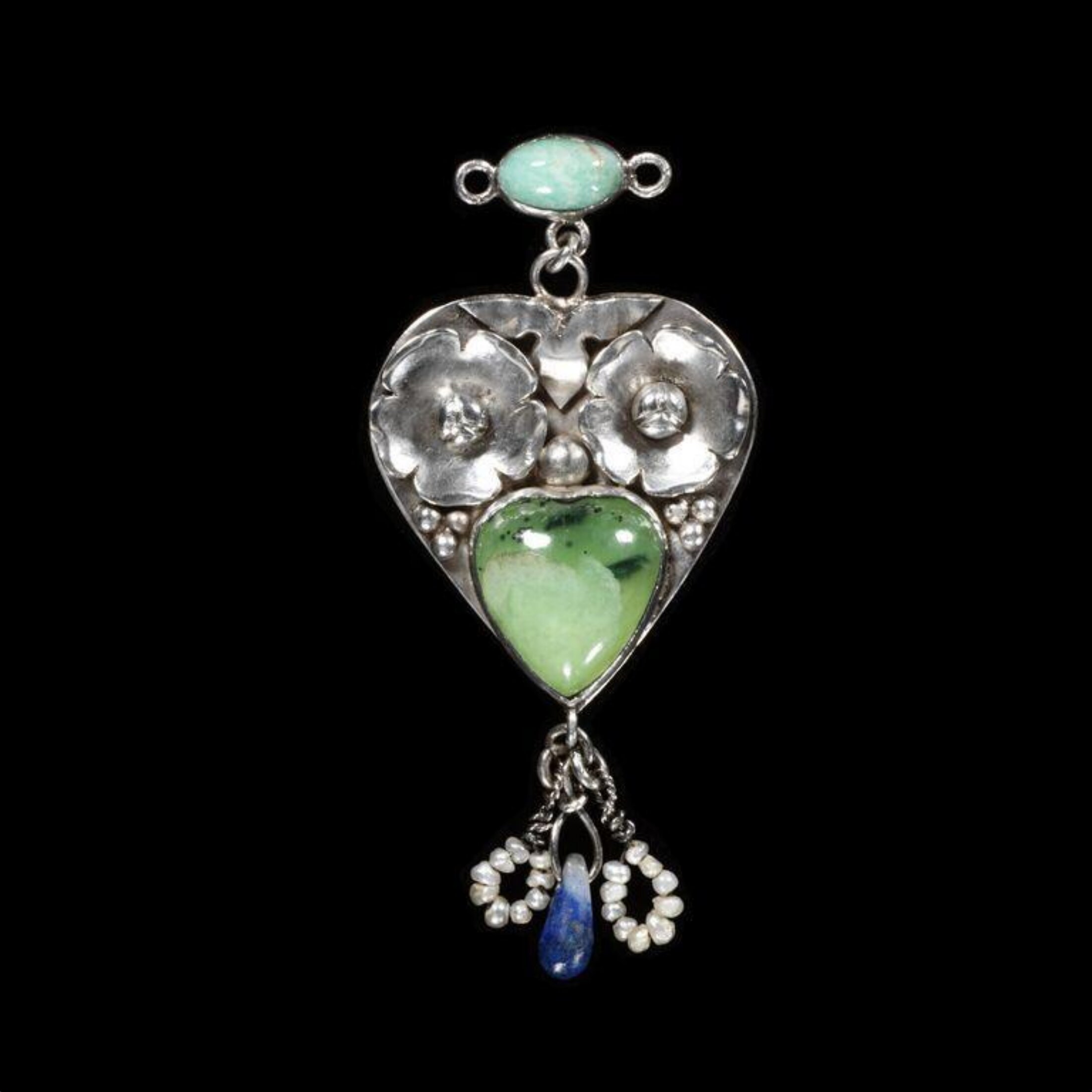 Not strictly confined to the Medieval period, her book cover and jewelry designs offer other connections to days gone by. The art of embroidered book bindings had waned over a century earlier, but in the late 1880s, Morris’ needlework helped to contribute to its renaissance. One such example is her binding for Ernest Lefébure’s Embroidery and Lace (1888), which encompasses an intricate design fitting of the book’s subject matter. The cover’s gold thread and small seed pearls contribute to this, with a symmetrical design and entwined stems that grow outwards from the spine and extend across to the front and back covers. The use of beadwork, though absent in much of her work for Morris & Co., was certainly not unfamiliar to her. Her jewelry designs indicate she was comfortable working with a wide array of gemstones. Included in one of her pendant designs, in addition to seed pearls, are amazonite, williamsite, and lapis lazuli in a heart-shaped form. The heart-shaped motif became increasingly popular during this time period, as it was frequently featured in traditional folk designs across Europe and Scandinavia. May Morris’ work with book bindings and jewelry broadened her expertise, further cementing her place as a key figure in the Arts and Crafts movement.