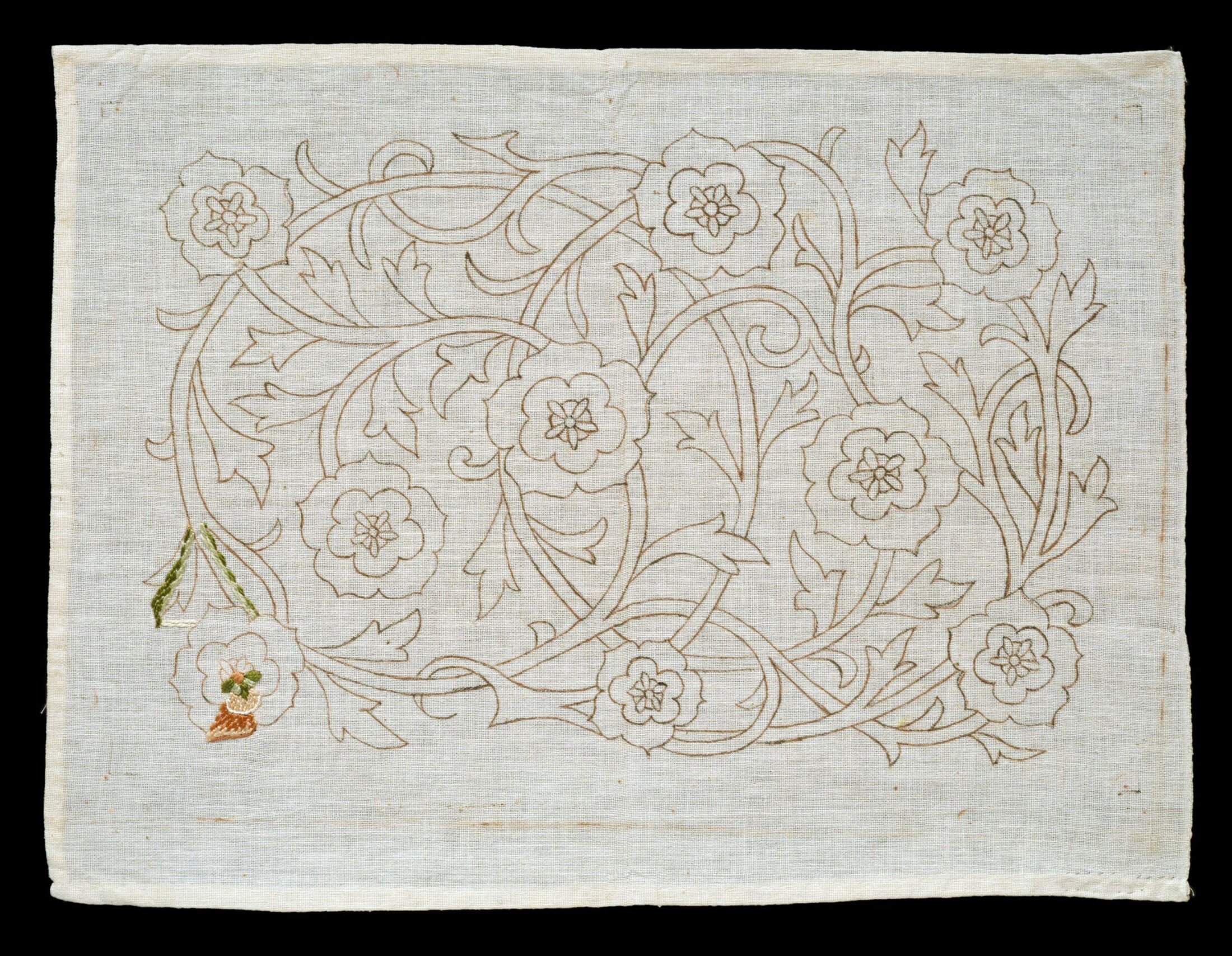 Morris encouraged a collective approach to art-making, which embraced both amateurs and other professionals alike. Oftentimes, she would collaborate with other embroiderers to bring her designs to fruition, reminiscent of Renaissance workshops and guild collaboration. Perhaps this work environment inspired her to create the Women’s Guild of Arts in 1907, which encouraged artists, craftspeople, and architects by showcasing their work and hosting discussions. This was especially important considering that the Art Workers Guild excluded women until 1972. Morris also encouraged newcomers to the practice of embroidery, as she offered private embroidery lessons and also published a beginner’s guide: Decorative Needlework in 1893. In practice, amateur embroiderers could acquire embroidery kits from Morris & Co. to create designs such as Small Rose following one of Morris’ patterns.